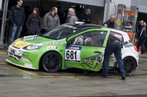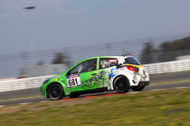 In 10:32.599 Minuten umrundete Stephan Epp die regennasse Nordschleife im Zeittraining und ließ damit die versammelte Konkurrenz in der Renault Clio-Klasse hinter sich. Schon wenige Minuten nach dem Rennstart nahm der Verlauf des Wochenendes jedoch eine dramatische Wendung. In der ersten Runde war Brinkmann mit Regenreifen unterwegs, ehe er anschließend Slicks aufziehen ließ. „Dann hat es plötzlich doch wieder geregnet und Dominik hat die Leitplanken touchiert“, resümierte Teamchef Reinhard Sesterheim enttäuscht.